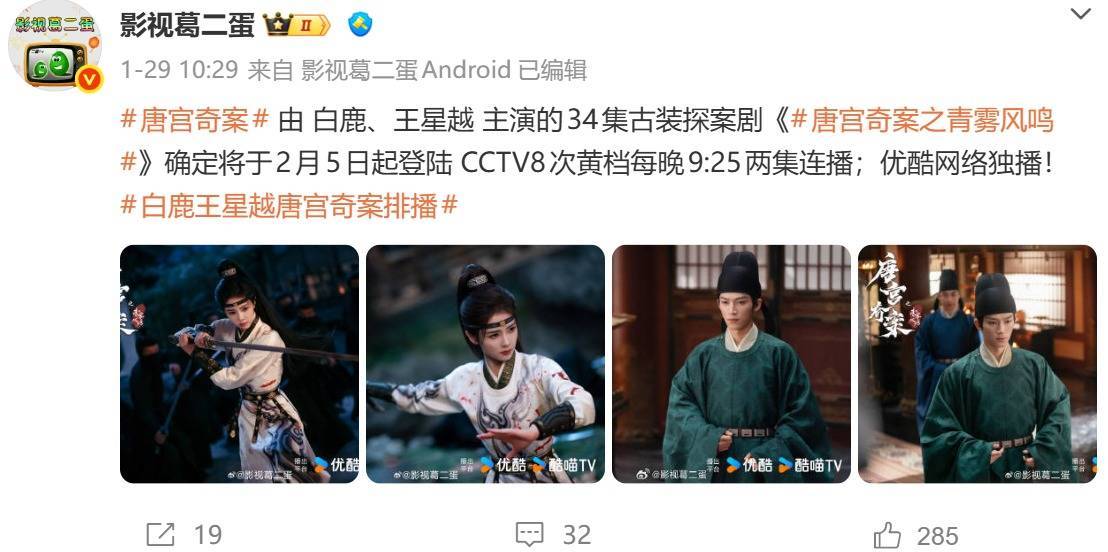 不过,目前该剧的官方账号还没确定定档时间,但央视排播日期已经出来了,2月5日央八次黄金档上线,大家就拭目以待吧。